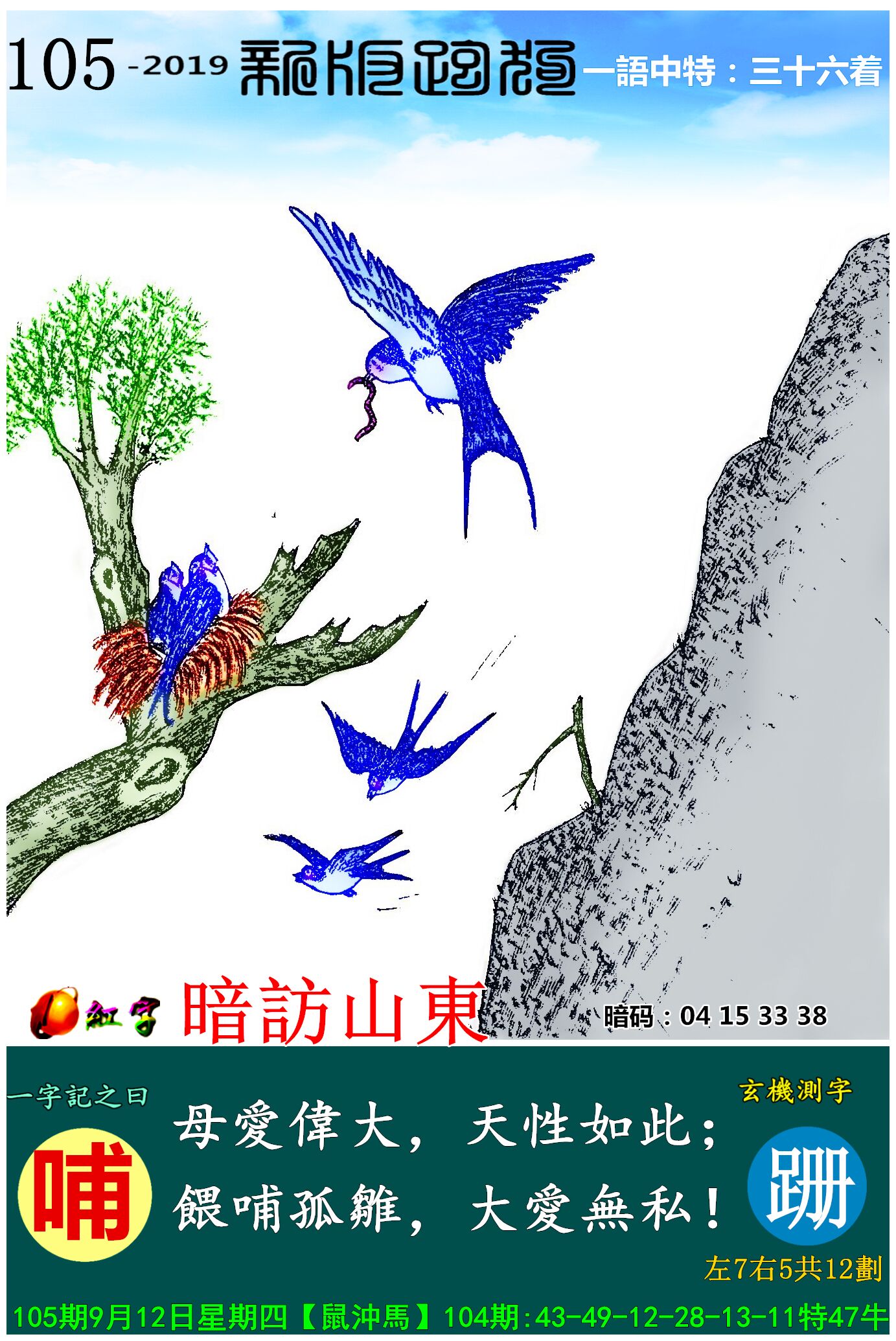 105期新版跑狗一字記之曰:【哺】 母愛偉大,天性如此; 餵哺孤雛,大愛無私! 玄機測字:《跚》 一語中特:三十六着