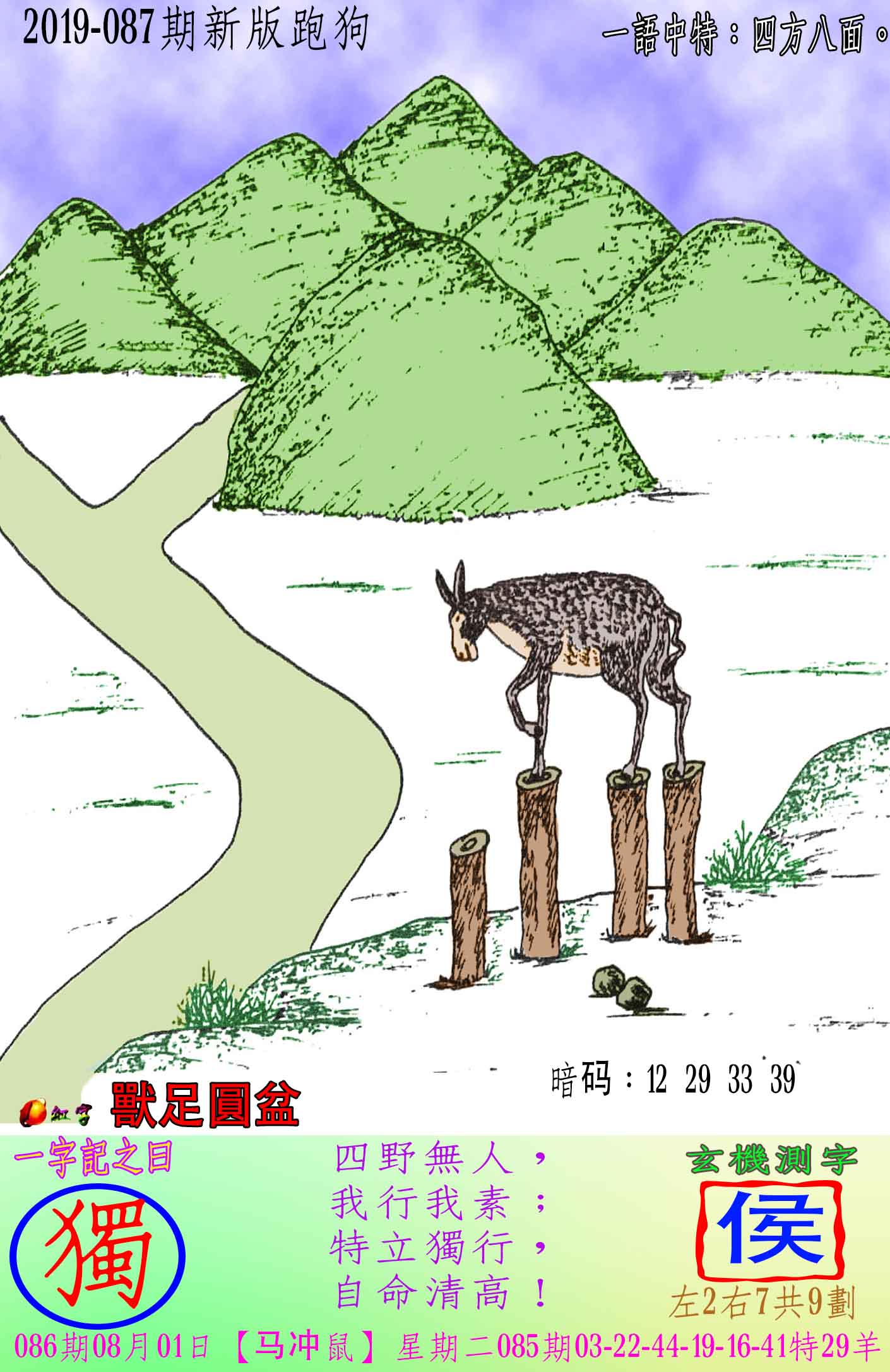 087期新版跑狗一字記之曰:【獨】 四野無人,我行我素; 特立獨行,自命清高! 玄機測字:《》一語中特:四方八面。