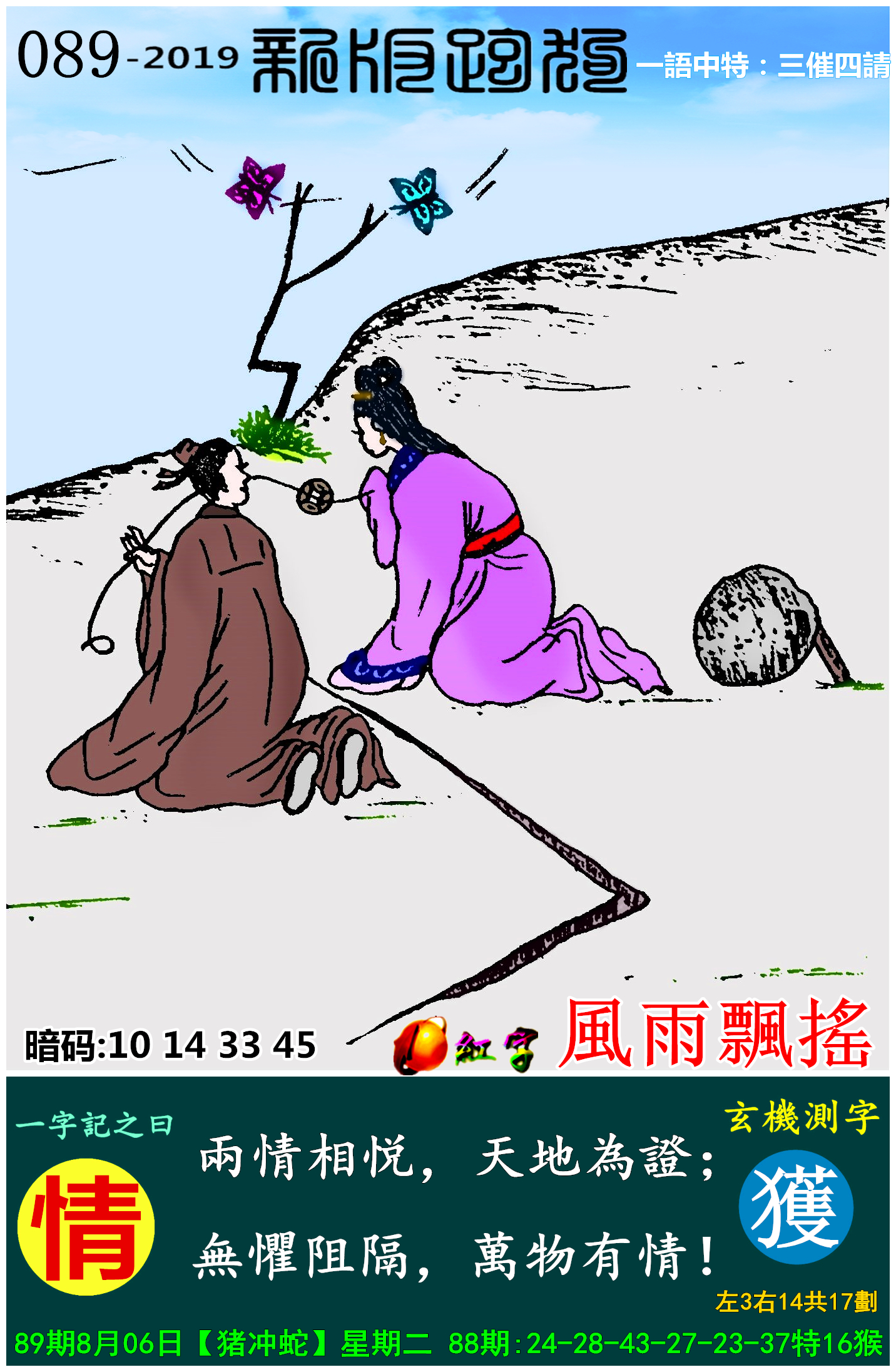 主题 : 089期新版跑狗一字記之曰:【情】 兩情相悅,天地為證; 無懼阻隔,萬物有情! 玄機測字:《獲》一語中特:三催四請。