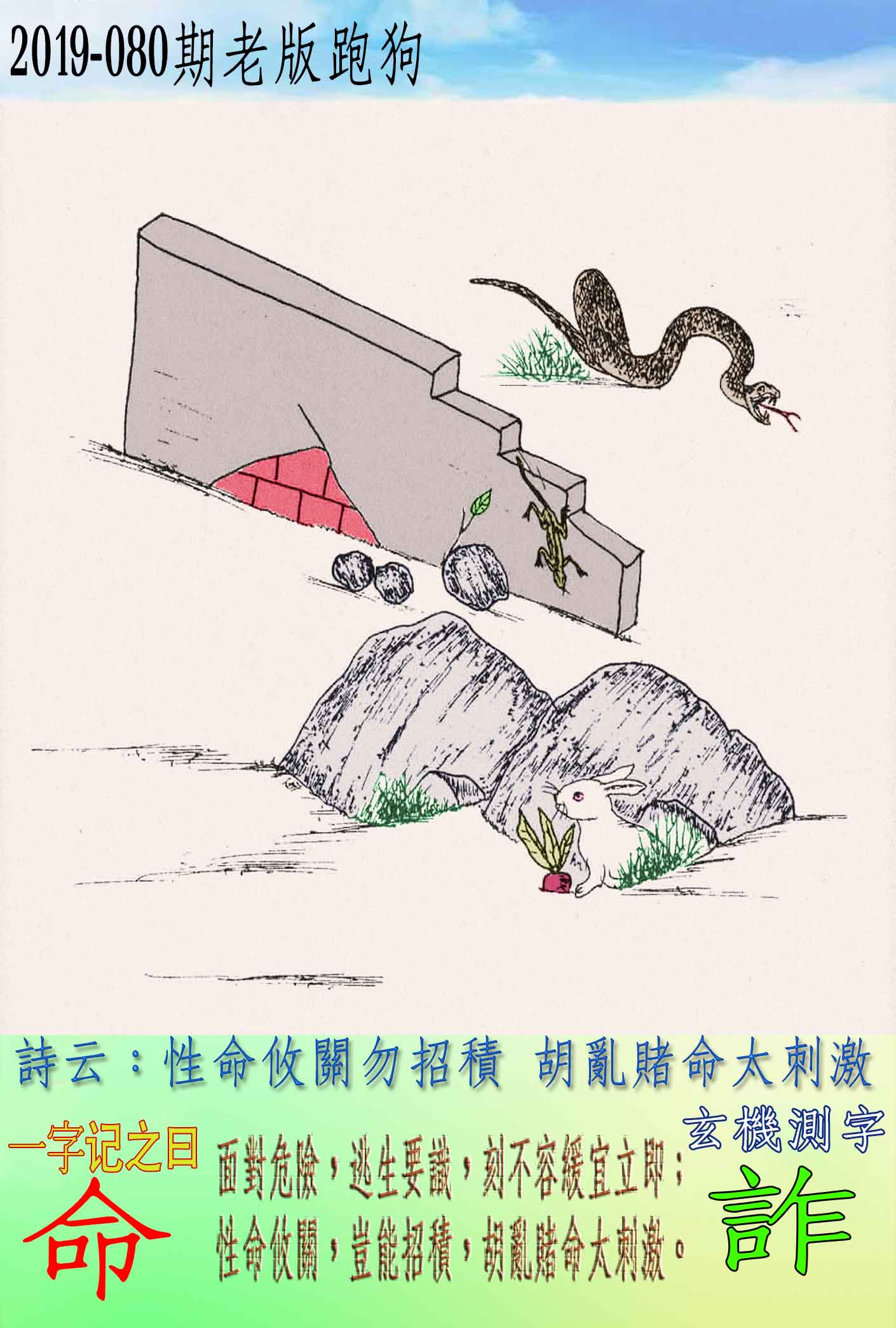 080期老版跑狗一字記之曰:【命】 詩雲:性命攸關勿招積,胡亂賭命太刺激。 面對危險,逃生要識,刻不容緩宜立即; 性命攸