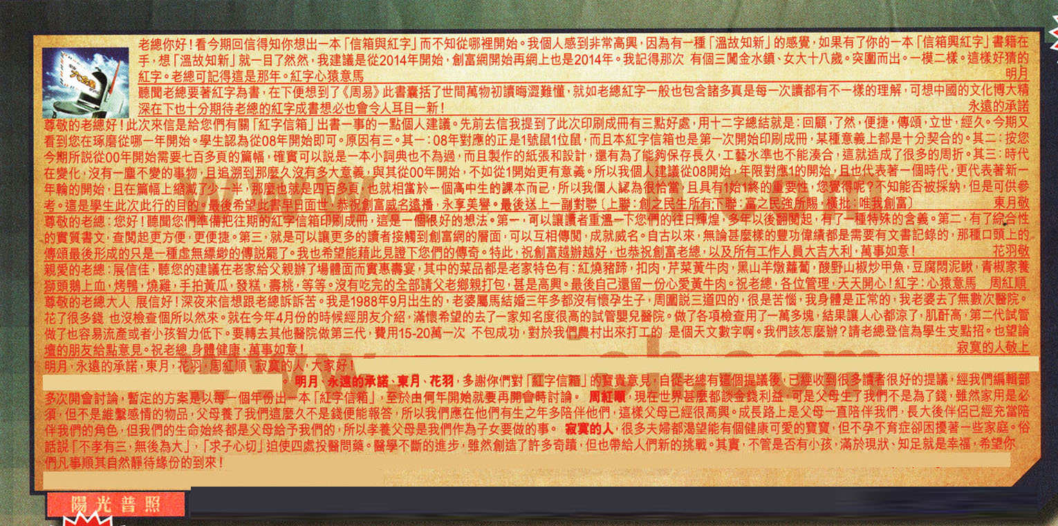 【4】 尊敬的老總:您好!聽聞您們準備把往期的紅字信箱印刷成冊,這是一個很好的想法。第一可以讓讀者重温一下您們的往日輝煌,多年以後翻閱起,有了一種特殊的含羲。第二:有了綜合性的實質書,文查闃起更方便,更便捷。第三,就是可以讓更多的讀者接觸到創富網的層面,可以互相傳鬩, 成就威名。自古以來,無論甚麼樣的豐功偉績都是需要有文書記錄的,那種口頭上的傳颂最後形成的只是一種虚無缥緲的傳說罷了。我也希望能藉此見證下您們的傳奇。特此;祝創富越辦越好,也恭祝創富老總,以及所有工作人员大吉大利,萬事如意!---花羽敬