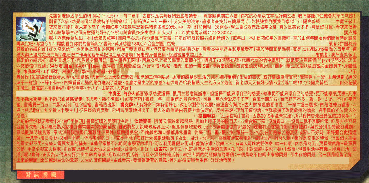 【3】呢排老總你為吐出一本「信箱與紅字」而廢盡心思,向你講聲辛苦曬,好吧好吧就按照老總你所講的『每年出一本』信箱紅字的書籍吧,至於由何年開始你們開會時討論後再決定吧,希望今年年尾能看到你們的信箱紅字書籍;萬分感謝! 80期六合皇拼圖:馬蛇 ---讀者:拼圖粉絲