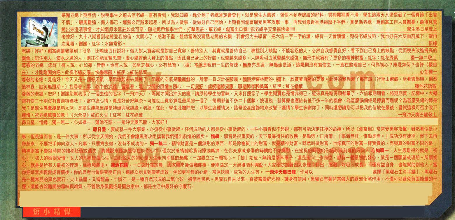 【1】感謝老總上期登信,说明學生之前去信老總一直有看到,我就知道,缘分到了老總肯定會登刊。就是學生太愚鈍,領悟不到老總給的好料,雲裡霧裡看不清,學生這兩天領悟到了一個真諦「出言不慎」,駔馬難追,傷人傷己,運勢必定越來越差,所以為人做事,從做好自己開始。上期看到創富網受黑客攻擊一事,再想到最近香港這麼不平靜,真是為老總,為創富工作人員擔憂。最後見管總出來澄清事情,才知道原來黑莊如此可惡,願老總帶领學生們,打擊黑莊,幫老總。創富出口氯!!!祝老德平安幸福快樂!! --- 學生易日星敬上