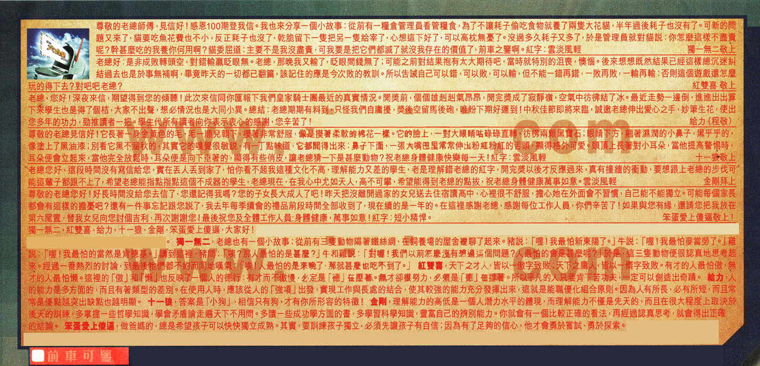 【1】尊敬的老總師傅,見信好 !感恩100期登我信。我也來分享一 個小故事:從前有一 糧倉管理員看管糧食,為了不讓耗子偷吃食物就養了两雙大花貓,半年過後耗子也沒有了。可新的問題又來了,貓要吃魚花费也不小,反正耗子也沒了,乾脆留下一售把另一雙給宰了,心想這下好了,可以高枕無憂了。沒過多久耗子又多了,於是管理員就對貓說:你怎麼這樣不盡貴呢?幹甚麼吃的我養你何用啊?貓委屈道:主要不是我没盡责,可我要是把它們都滅了就沒我存在的價值了,前車之鑒啊。紅字:雲淡風輕 --- 獨一無二敬上