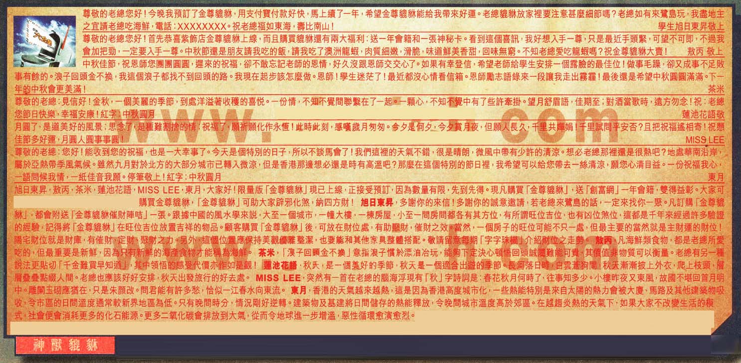 【6】尊敬的老總:您好!能收到您的祝福,也是一大幸事了。今天是個特別的日子,所以不談馬會了!我們這裡的天氣不錯,很是晴朗, 微風中帶有少許的清涼。想必老總那裡還是很熱吧?地處華南沿岸,屬於亞熱帶季風氣候。雖然九月對於北方的大部分城市已轉入微涼,但是香港那邊想必還是時有高溫吧?那麼在這個特別的節日裡,我希望可以給您帶去一絲清涼,願您心清目益。一份祝福我心,一語問候我情,一紙佳音我願。停筆敬上!紅字:中秋圓月---東月