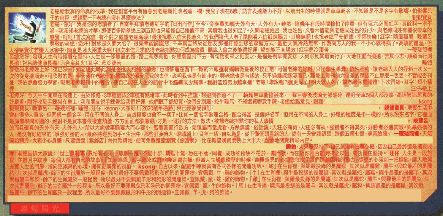 【2】.老總,你好!我是你的老讀者了,自當年拜讀老總紅字的「日出而作」至今,令晚輩知曉天外有天,人外有人。雖然,這幾年有段時間輸怕了停買,但有玩六必看紅字,其餘料一率不滲。我深知老總的才華,即使百多期參透三到五期也只能怪自己悟醒不高,其實我也很知足了。久聞老總姓呂,我也姓呂,久看六信能與老總同姓呂的好少,與老總同姓有種很榮幸的感覺,呵呵!首次寫信,有不對之處望老總海涵!最後祝愿六信天長地久,等我們這代人老了還能看六信鍛煉腦力,其樂無窮!也祝老總平安健康,幸福快樂!紅字:隨風飄蕩 晚輩呂